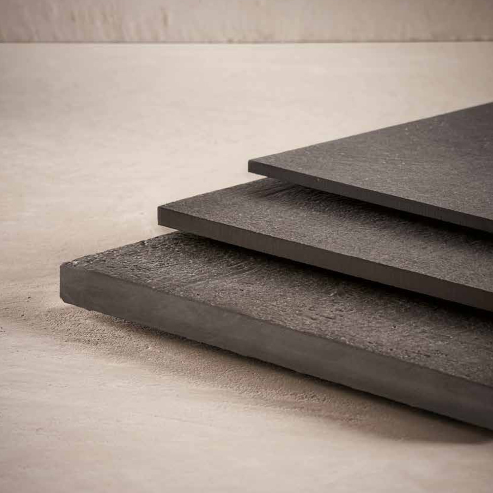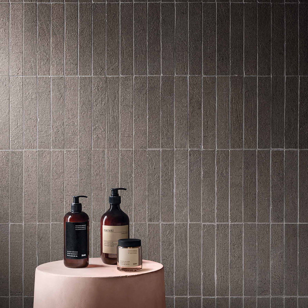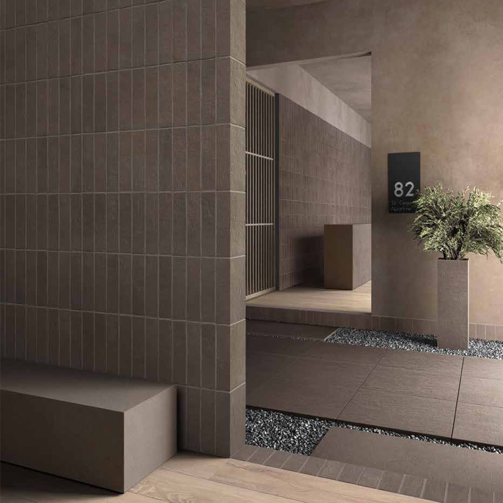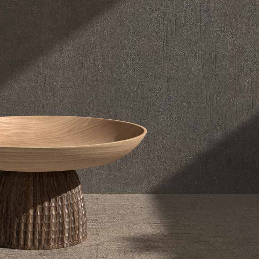 Un grès porcelaine à la manière sensorielle, vivante et riche dont l’effet patiné et imparfait crée la fascination. S’inspirant de l’élément terre, la recherche chromatique définit trois tons allant du blanc de la chaux au noir de la pierre de lave, en passant par la teinte chaude de la corde.